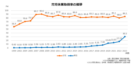 近年の働き⽅改⾰を背景に、男性の育児参加への意識は⾼まっています。厚⽣労働省が公表した2025年版の「厚⽣労働⽩書」によると、2023年度の男性育休取得率は30.1%と過去最⾼を記録しました。これは⼤きな前進といえるでしょう。しかし、⼥性の取得率は84.1%と⾼い⽔準で推移しており、育児で休むことが社会的に定着しているのに対して、男性の育休取得率は依然として低⽔準に留まっているのが現状です。